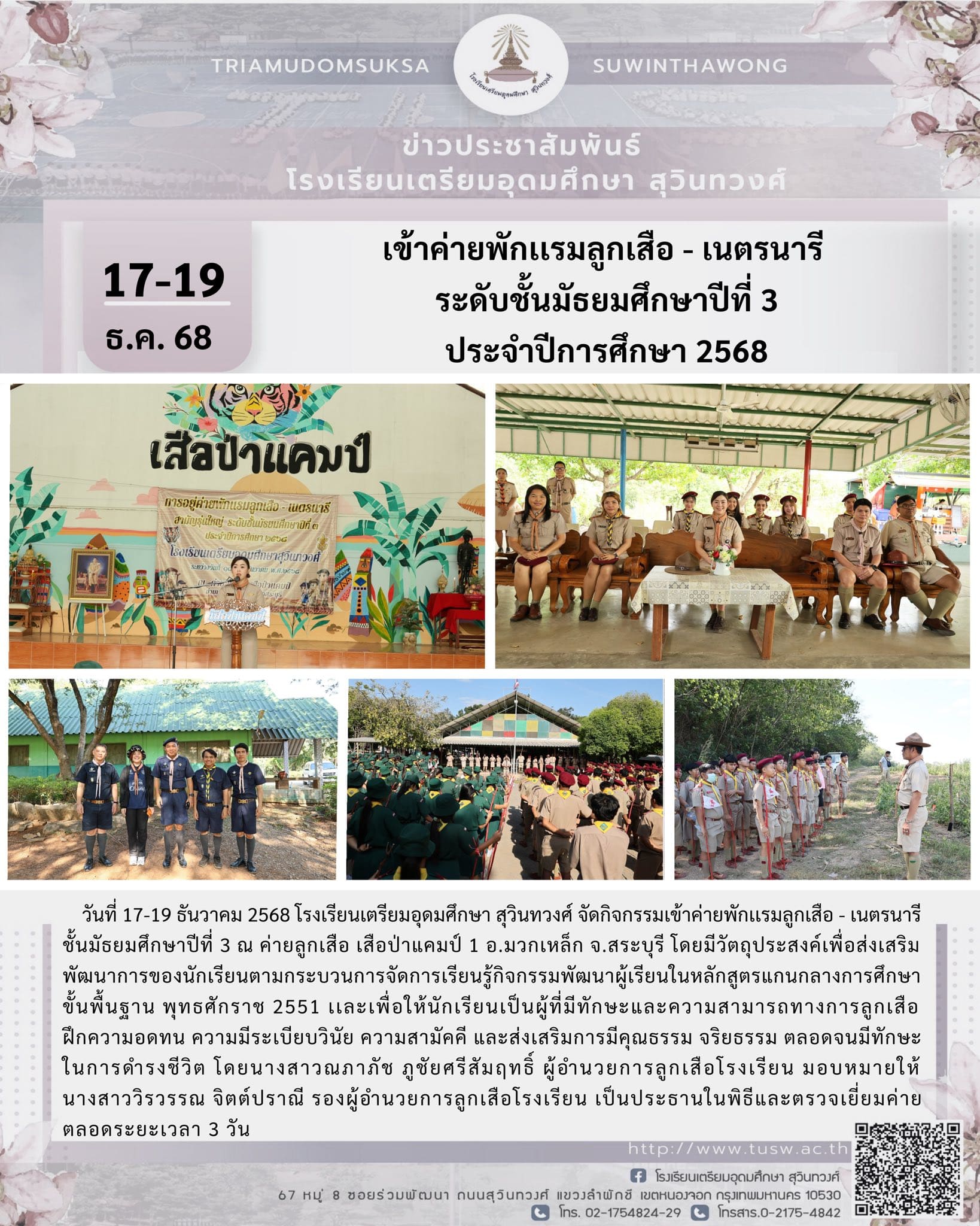 กิจกรรมเข้าค่ายพักเเรมลูกเสือ - เนตรนารี ชั้นมัธยมศึกษาปีที่ 3 ณ ค่ายลูกเสือ เสือป่าแคมป์ 1 อ.มวกเหล็ก จ.สระบุรี