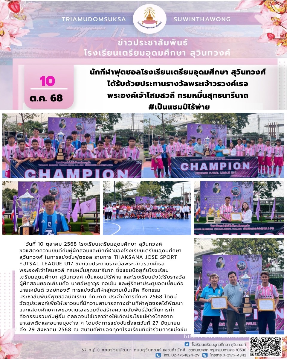 นักกีฬาฟุตซอลโรงเรียนเตรียมอุดมศึกษา สุวินทวงศ์ ได้รับถ้วยประทานรางวัลพระเจ้าวรวงศ์เธอ พระองค์เจ้าโสมสวลี กรมหมื่นสุทธนารีนาถ #เป็นแชมป์ไร้พ่าย