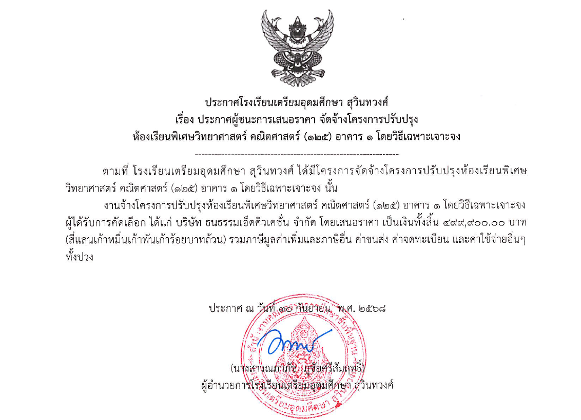 ประกาศโรงเรียนเตรียมอุดมศึกษา สุวินทวงศ์ เรื่อง รายชื่อนักเรียนผู้มีสิทธิ์เข้าสอบคัดเลือก ประเภทห้องเรียนพิเศษ ม.1 ปีการศึกษา 2568 25 ก.พ. 68